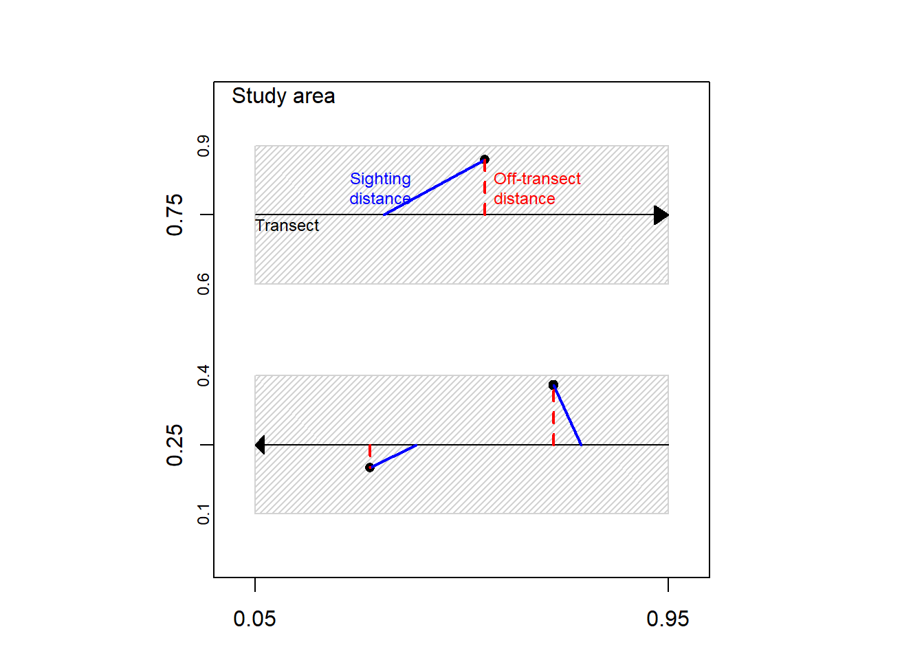 To estimate the effectively sampled area, assumptions and additional information about target locations relative to observers are required. Distance-sampling studies not only collected basic target counts and transect lengths, they also collect perpendicular distances between sighted targets and the search route (Figure 1). Collection of perpendicular distances, from sampling route to target, is what gives distance-sampling its name and is the method’s distinguishing feature. These off-transect distances will be used to actually estimate the decline in detection probabilities, but only after making two key assumptions.
