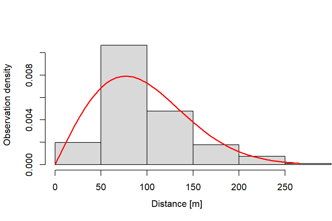 Once the data are imported, the first step is to fit a detection function. Before we do so, explore the distribution of the distances: