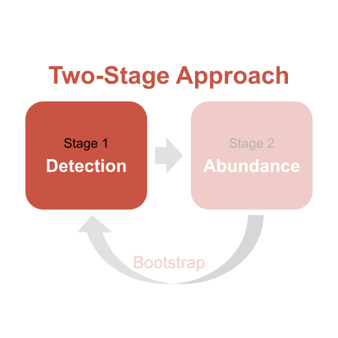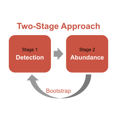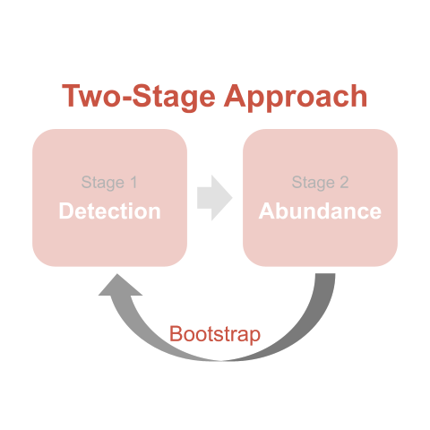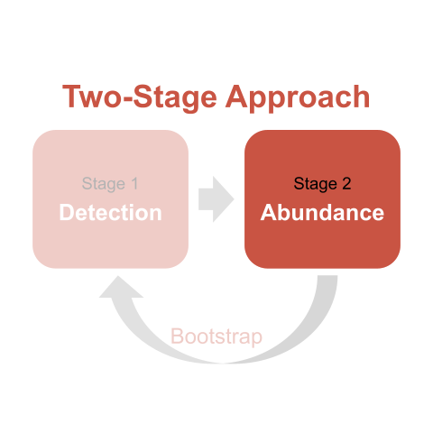 Carlisle and Chalfoun (2020) state that the number of sparrows counted at a site is the result of two processes: an ecological process affecting latent abundance (latent because it is incompletely observed due to detection error; Kéry and Schaub 2012) and an observation process that produces counts of latent abundance when probability of detection < 1 (Kéry and Schaub 2012). The two-stage approach provides the flexibility to model each process independently and (when done correctly with a bootstrap – more on that later) incorporates the uncertainty in estimating both processes into the final results (Buckland et al. 2009, 2015). The first stage estimates detection probability (often, but not necessarily always) in relation to covariates and generates site-specific estimates of sparrow density. This stage adjusts counts for imperfect and variable detection arising at different sites. The second stage models those estimated sparrow densities in relation to other variable(s) of interest (often, but not necessarily always) using some form of a regression model. As illustrated in the diagram above, what happens in the 2nd stage depends on what happened in the 1st stage. Or, a statistician might say that abundance estimates are conditional on detectability estimates.