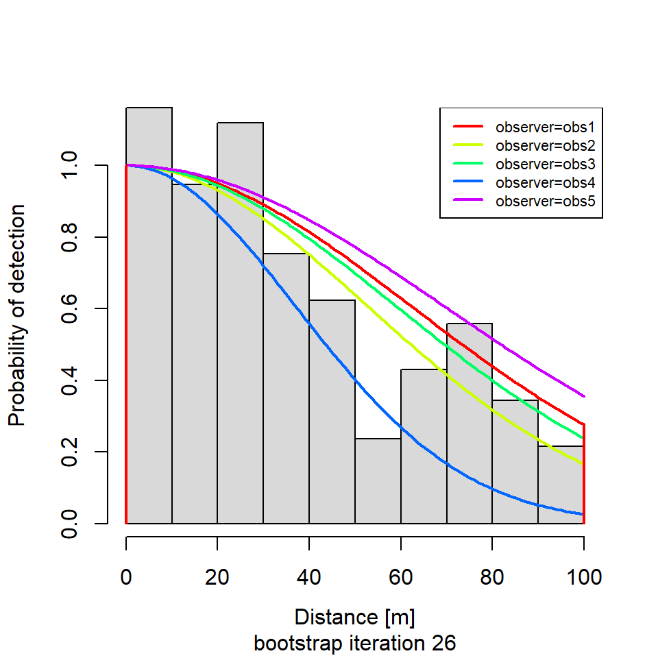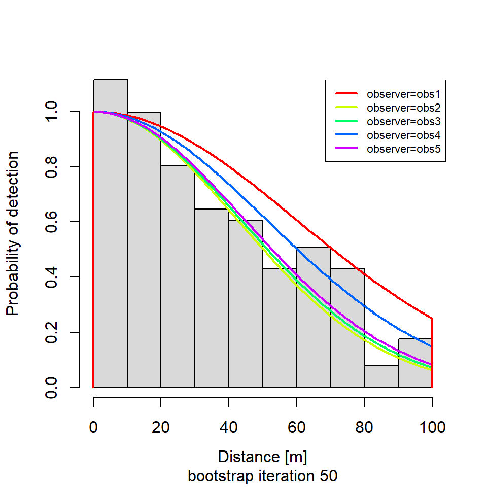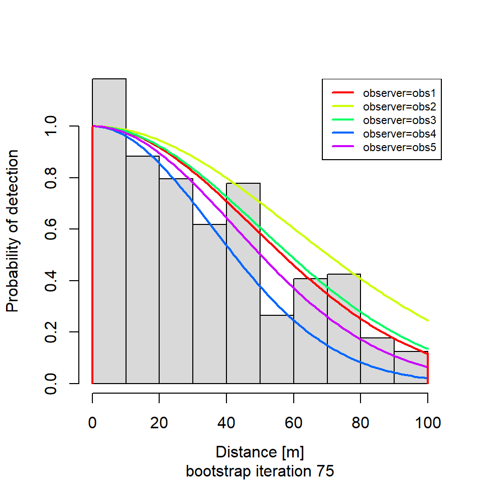 Although outside the scope of this tutorial, users should be aware that hierarchical distance-sampling models (made popular by R package unmarked, Fiske and Chandler 2011, Kellner et al. 2023) make use of an integrated or unconditional likelihood, meaning the detection and abundance processes are estimated in one model that accounts for uncertainty at both stages without requiring the bootstrap method we apply in this tutorial. See Kéry and Schaub 2012 and Kéry and Royle 2016 for more details.