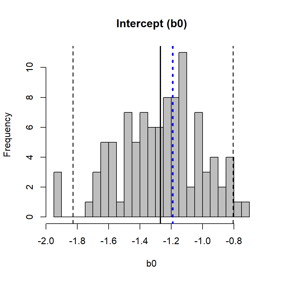 abline(v = quantile(b0, c(0.025, 0.975)), lwd = 1.5, lty = "dashed")
