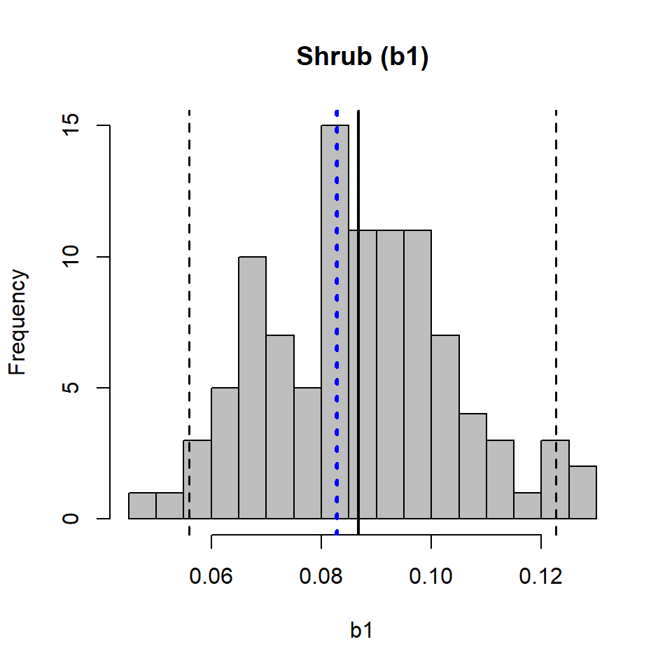 We now have a distribution for each of the regression coefficients in the Poisson GLM abundance model. If done correctly, the mean estimate from the bootstrap (solid black line, Figure 3 and Figure 4) should be very similar to the estimate from the original data (dotted blue line, Figure 3 and Figure 4). A 95% CI for each regression coefficient is estimated using the quantiles of the distribution (dashed black lines, Figure 3 and Figure 4).
