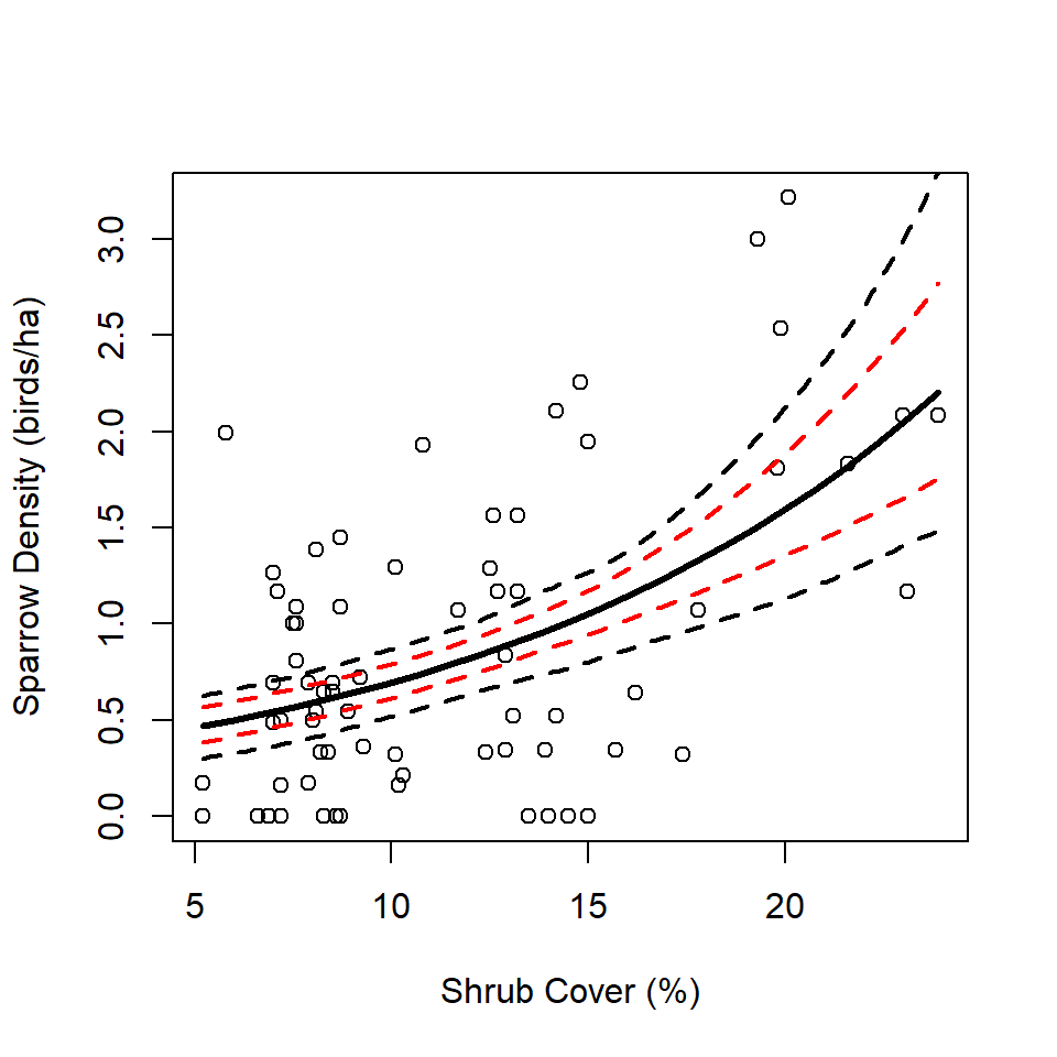 lines(predData$shrub, predData$upr, col = "red", lwd = 2, lty = "dashed")
