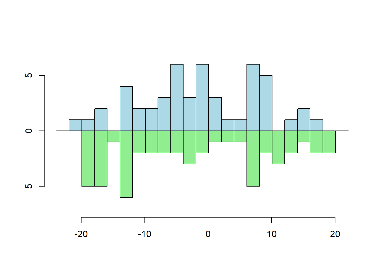 Input Parameters: The ... parameter can accept arbitrary numeric vectors. bin.width is a single bin width that will be applied to each vector. col is a vector of colors the same length as the number of vectors in .... dir is a vector containing 1 or -1 that is the same length as the number of vectors in .... Vectors corresponding to a -1 in dir are plotted downward in the mirrored histogram. Vectors corresponding to a 1 in dir are plotted upward in the figure. If probability is TRUE, all histograms are scaled to sum to 1.0. If probability is FALSE, histograms in the figure report frequencies. The remaining input parameters are standard R graphics parameters.