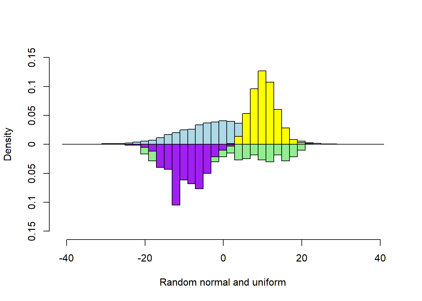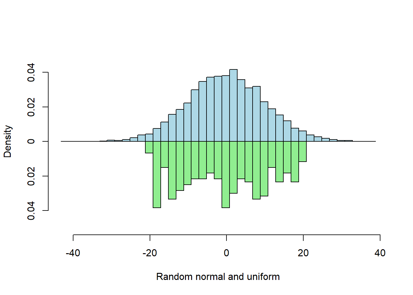 , xlab = "Random normal and uniform"