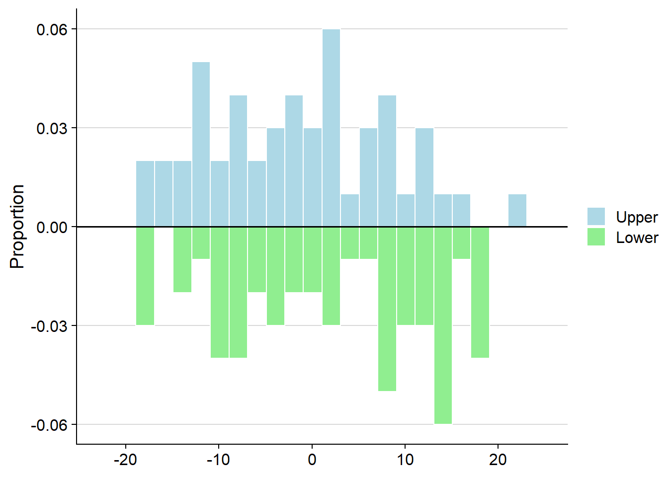 A crack R programmer (Jason) translated the mirrored histogram idea into code for ggplot, and I have to admit that the final plots look great, as most ggplot plots do. This post contains a modified version of Jason’s mirrored histogram code for ggplot.