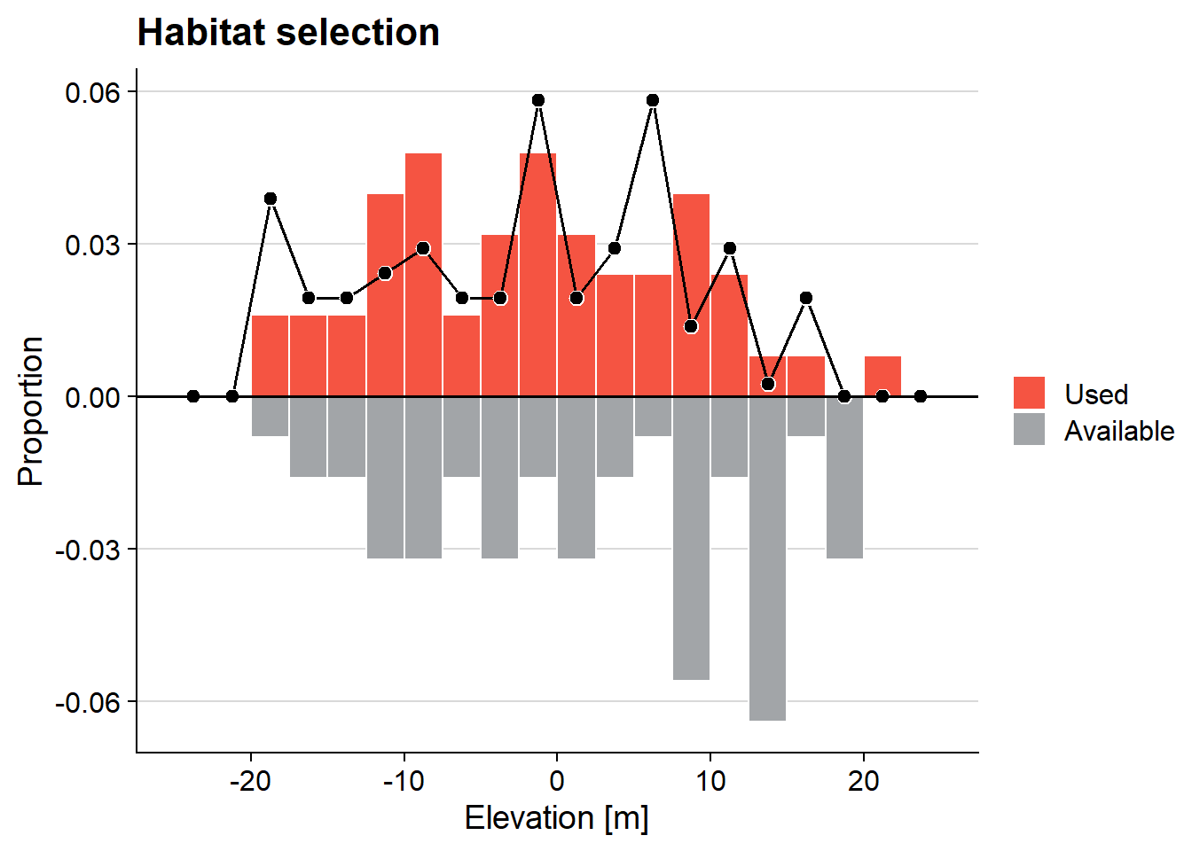 geom_smoothfunction. A smoothed function of the ratios is the one-dimensional resource selection function (RSF) for the resource plotted on the x-axis.