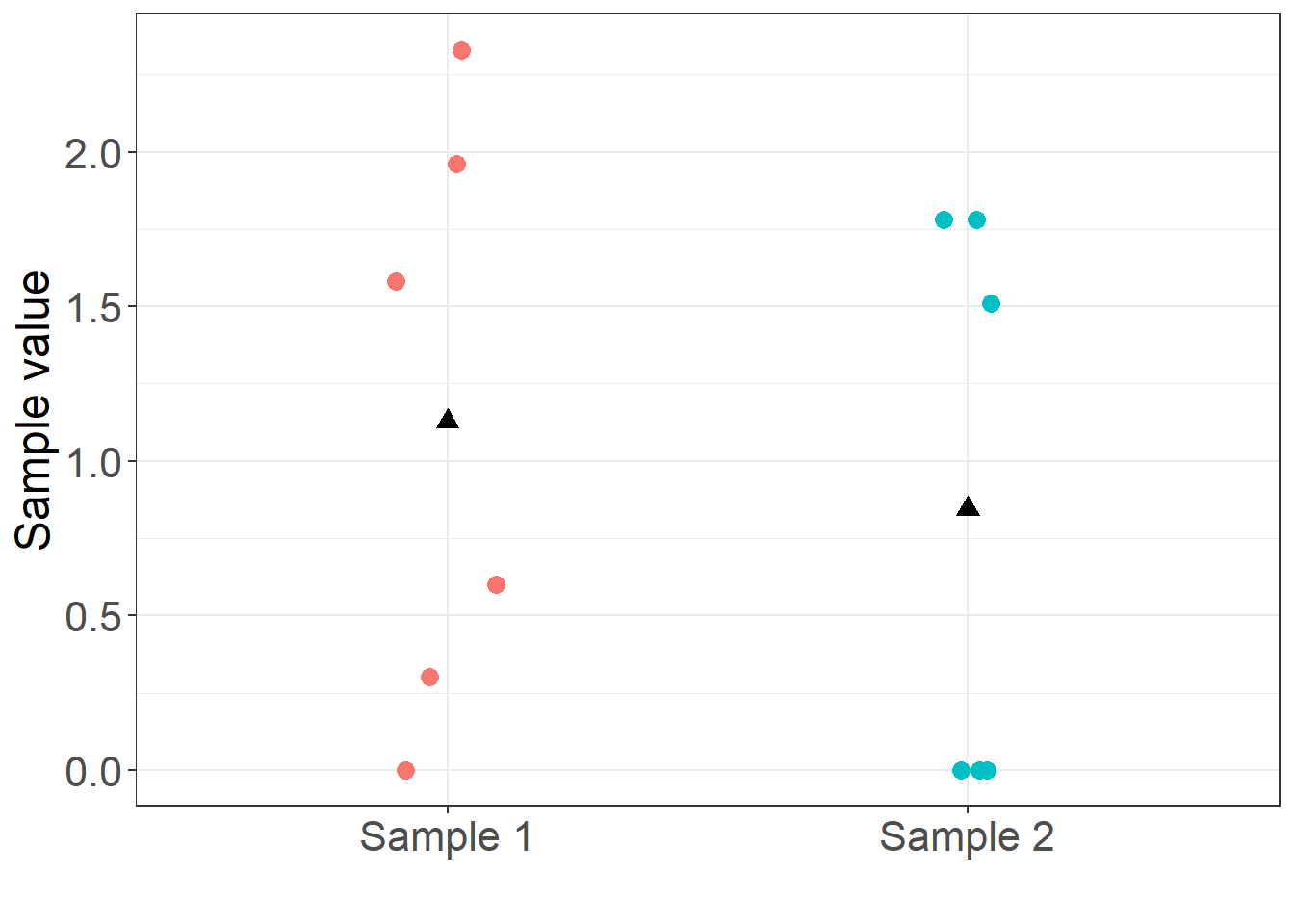 The following R code loads an example data set with 6 and 6 values in each sample. For clarity, the example data is listed in Table 1 and plotted in Figure 1.